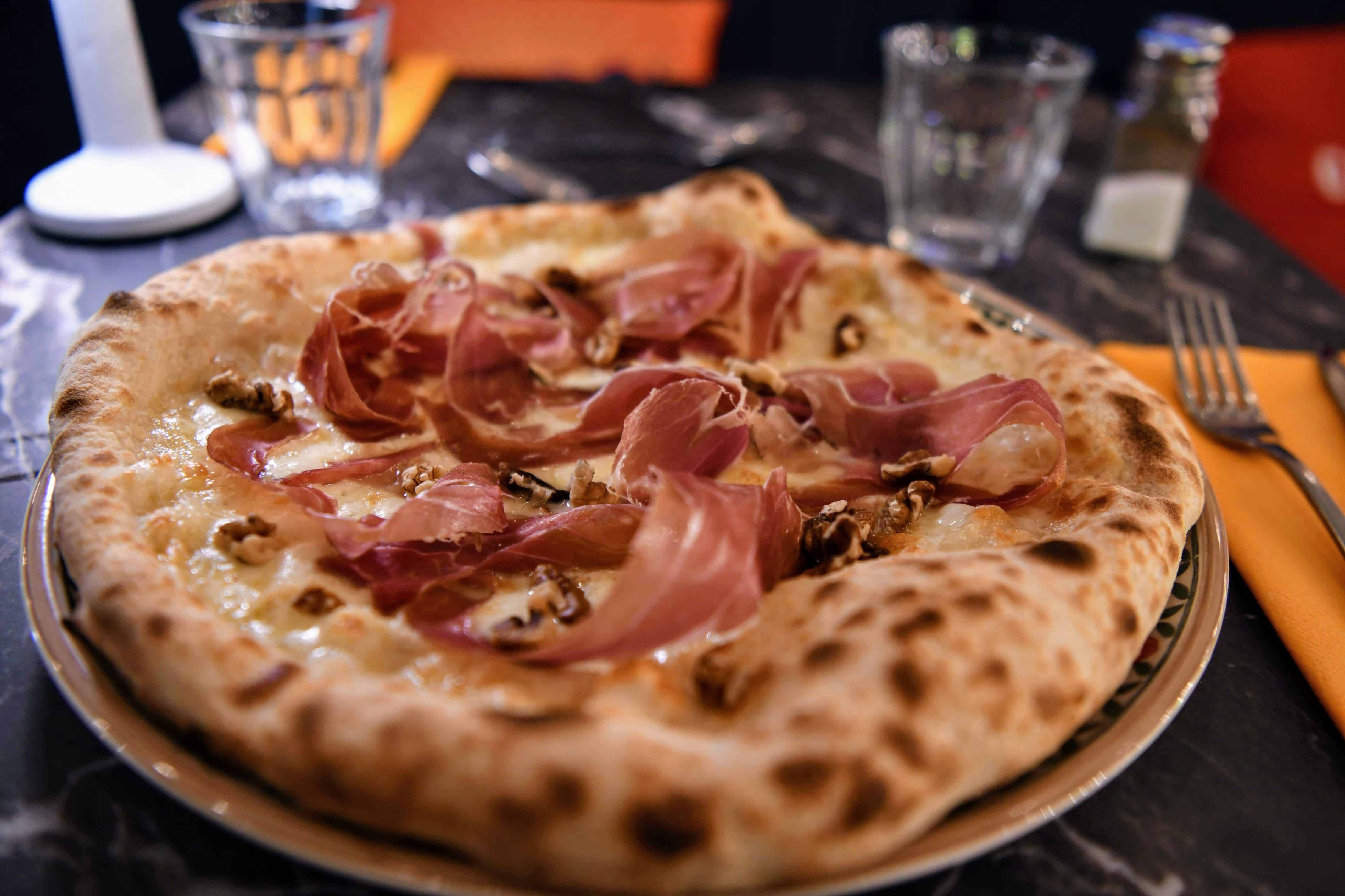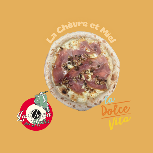 • Ingrédients :  Base mozzarella fior di latté, jambon de parme, chèvre, miel et noix.